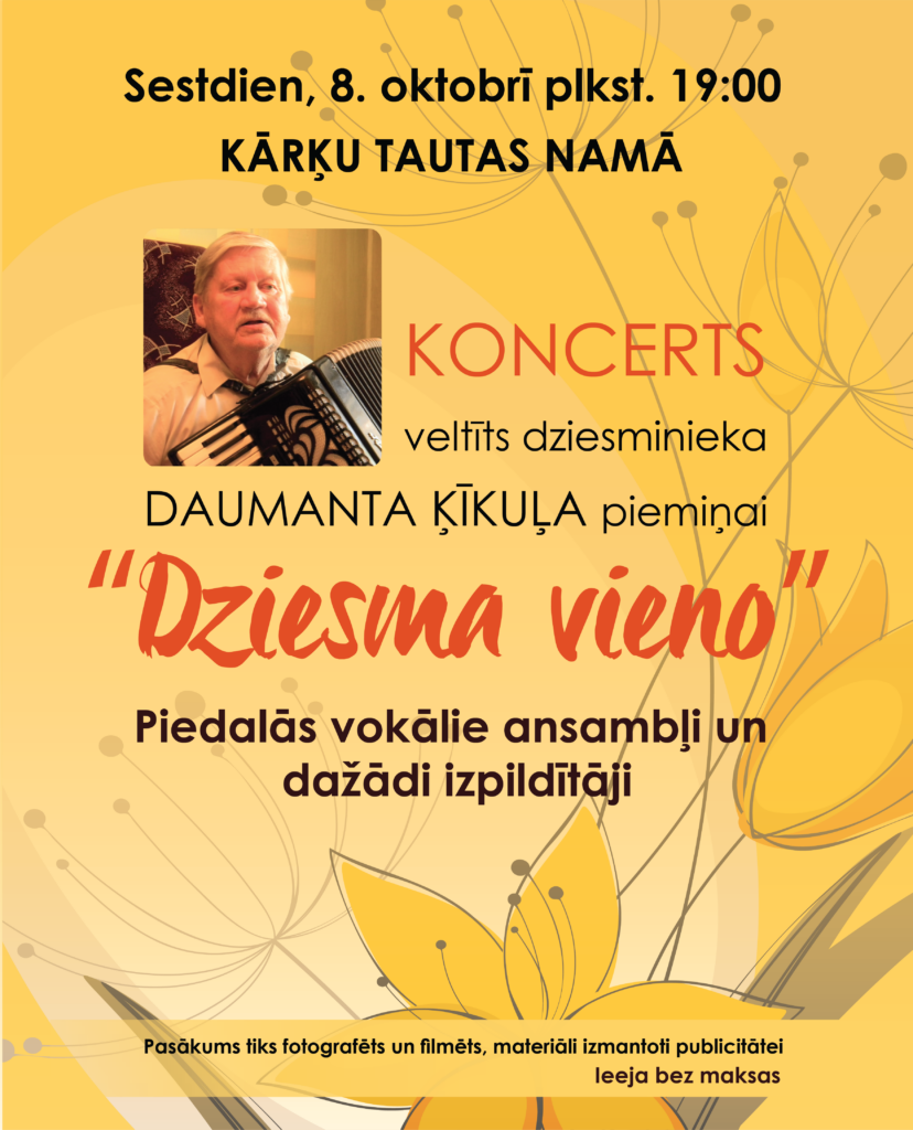 Sestdien, 8. oktobrī plkst. 19.00 Kārķu tautas namā skanēs Kārķu dziesminieka Daumanta Ķīkuļa komponētās dziesmas.