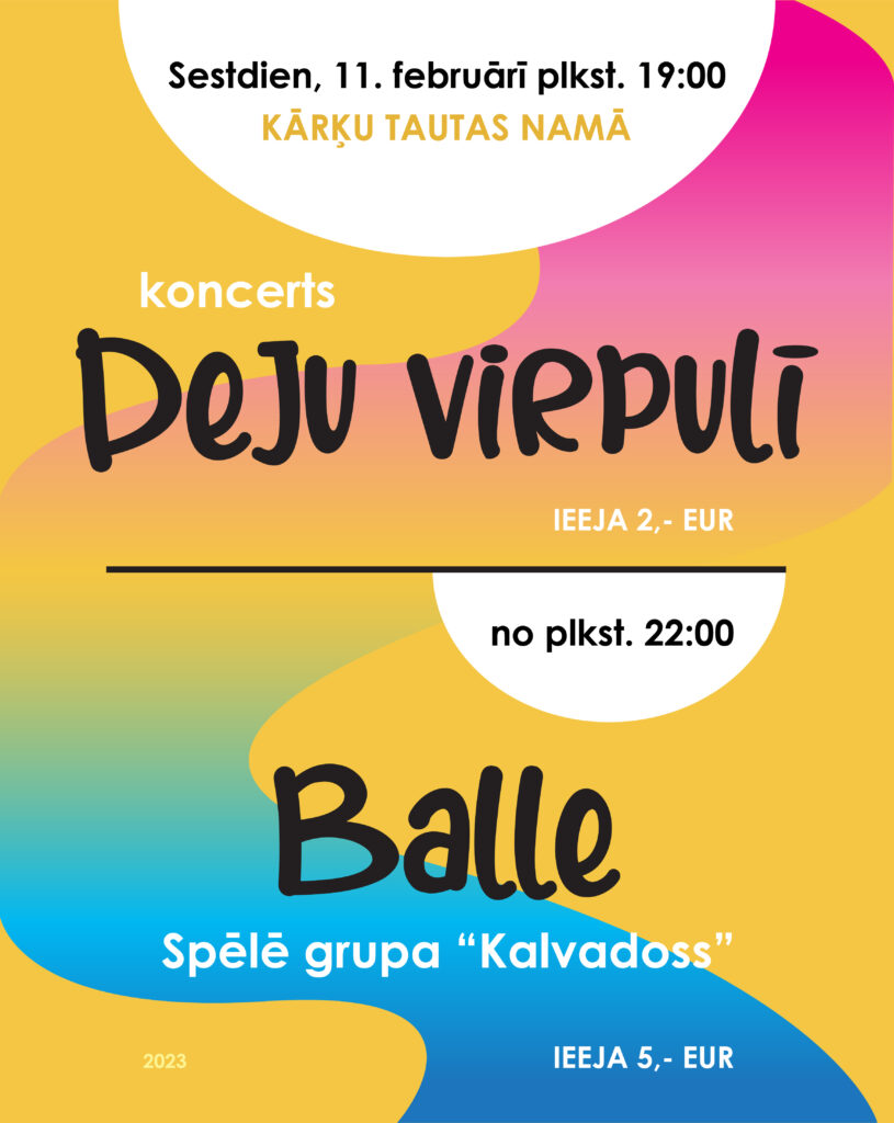 11. februārī plkst. 19.00 Kārķu tautas namā koncerts “ Deju virpulī ” , ieeja 2.00 EUR; no plkst. 22.00 – balle, spēlē grupa “ Kalvadoss”, ieeja 5.00 EUR
