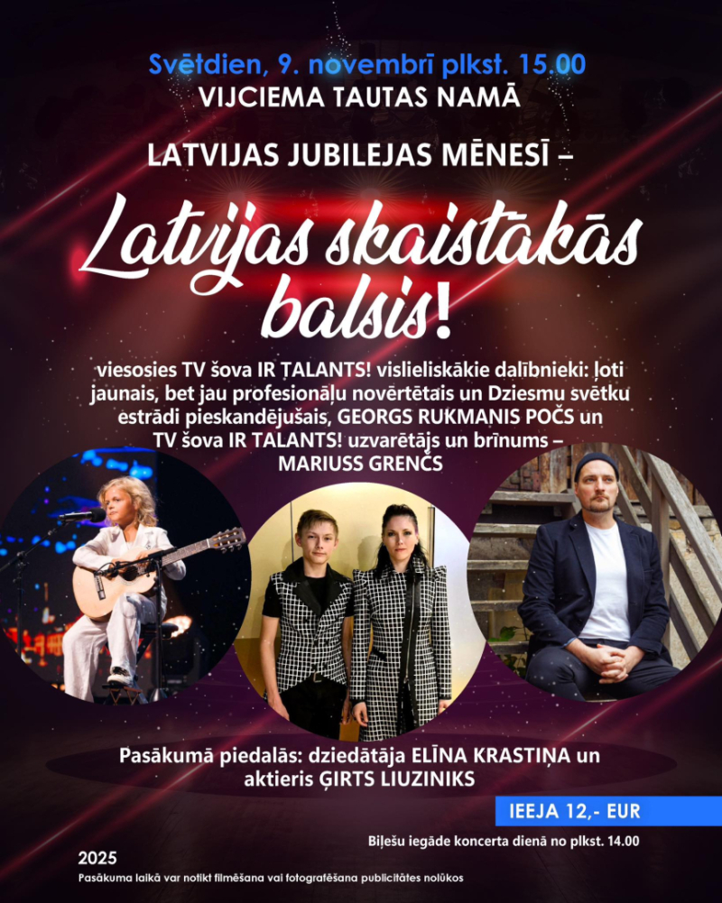 Latvijas valsts jubilejas mēnesī Vijciema Tautas namā valdīs svētku noskaņa – svētdien, 9. novembrī plkst. 15.00 ikviens aicināts uz koncertu „Latvijas skaistākās balsis!”