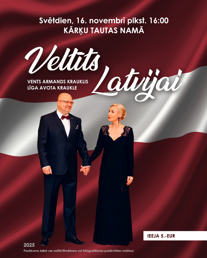 Svētdien, 16. novembrī plkst. 16.00 Kārķu tautas namā notiks īpašs svētku koncertuzvedums “Veltīts Latvijai”, kas tapis, godinot Latvijas valsts svētkus un mūsu tautas vērtības. Pasākuma norisē piedalīsies mākslinieku duets – Vents Armands Krauklis un Līga Avota Kraukle, dāvājot klausītājiem muzikālu un emocionālu svētku piedzīvojumu.