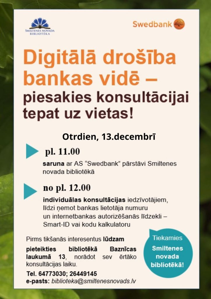 Smiltenes novada bibliotēka 13.decembrī plkst. 11.00 aicina interesentus uz sarunu “Digitālā drošība bankas vidē” ar AS “Swedbank” konsultantu. Sarunas mērķis ir palīdzēt ikvienam datorlietotājam atpazīt digitālās vides apdraudējumus un veicināt drošību interneta vidē.