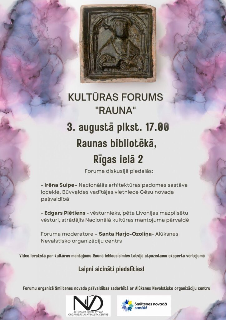 Aicinām 3. augustā plkst. 17.00 uz Raunas bibliotēku Rīgas ielā 2, lai kopīgi diskutētu par Raunas kultūrvēsturisko mantojumu, ieklausītos ekspertu viedokļos un radītu jaunas idejas.