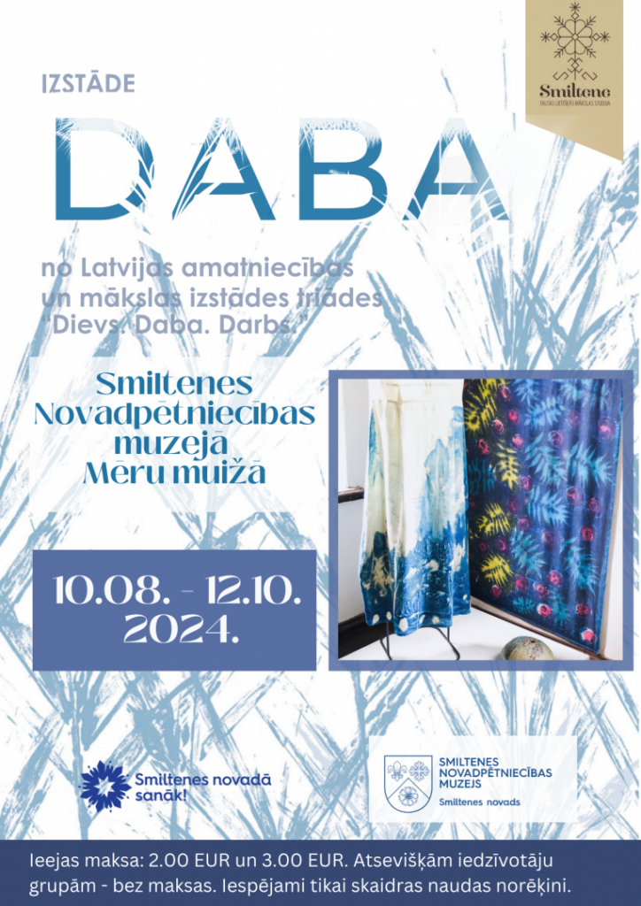 Aicinām apmeklēt vērienīgo Latvijas amatniecības un mākslas izstādi, kurai šogad nosaukumā dots vārds DABA. Tā ir otrā daļa no izstāžu triādes “Dievs. Daba. Darbs”, kuru organizē TLMS “Smiltene” sadarbībā ar Smiltenes Novadpētniecības muzeju. Izstādē eksponēti vairāk nekā 350 tautas lietišķās mākslas meistaru darbi no visas Latvijas.