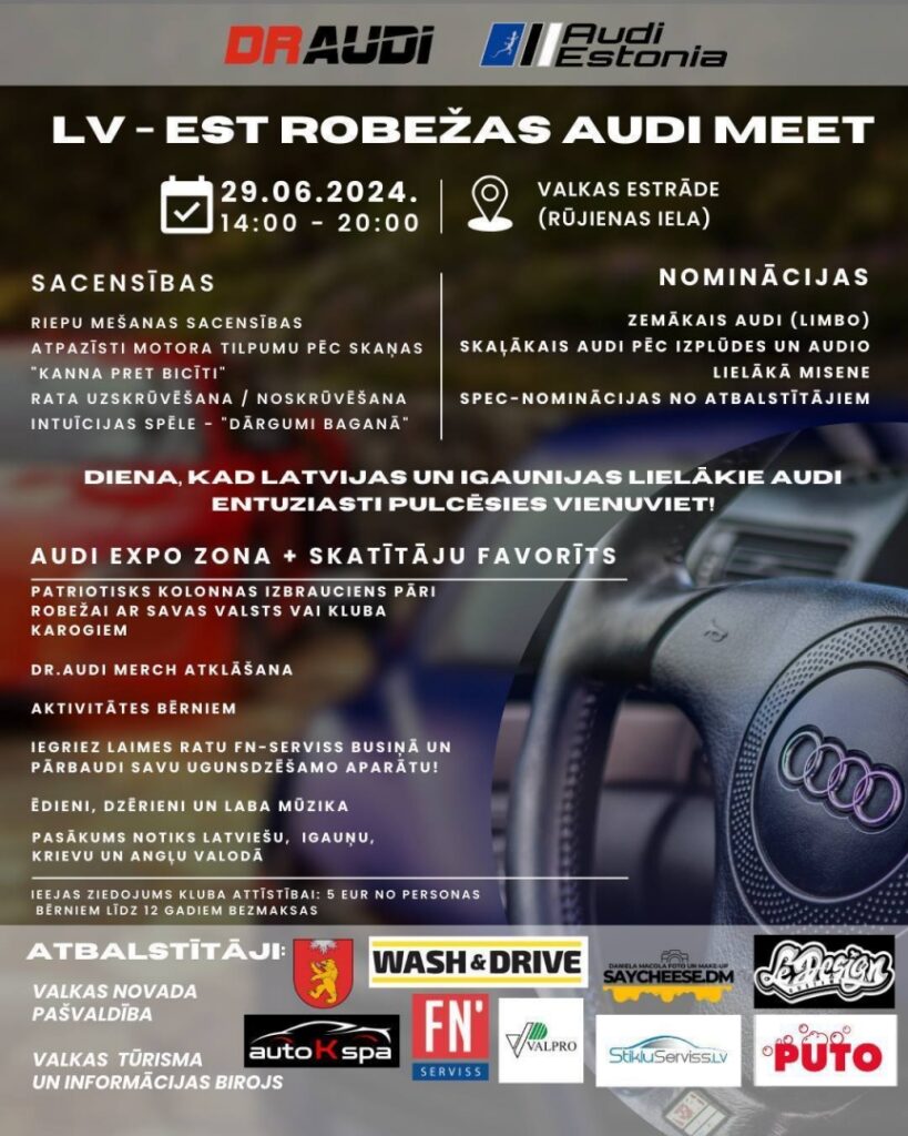 29. jūnijā no plkst. 14:00 Valkas brīvdabas estrādē notiks LV – EST robežas Audi saiets, kurā pulcēsies vadošākie Audi klubi un entuziasti no visas Latvijas un Igaunijas.