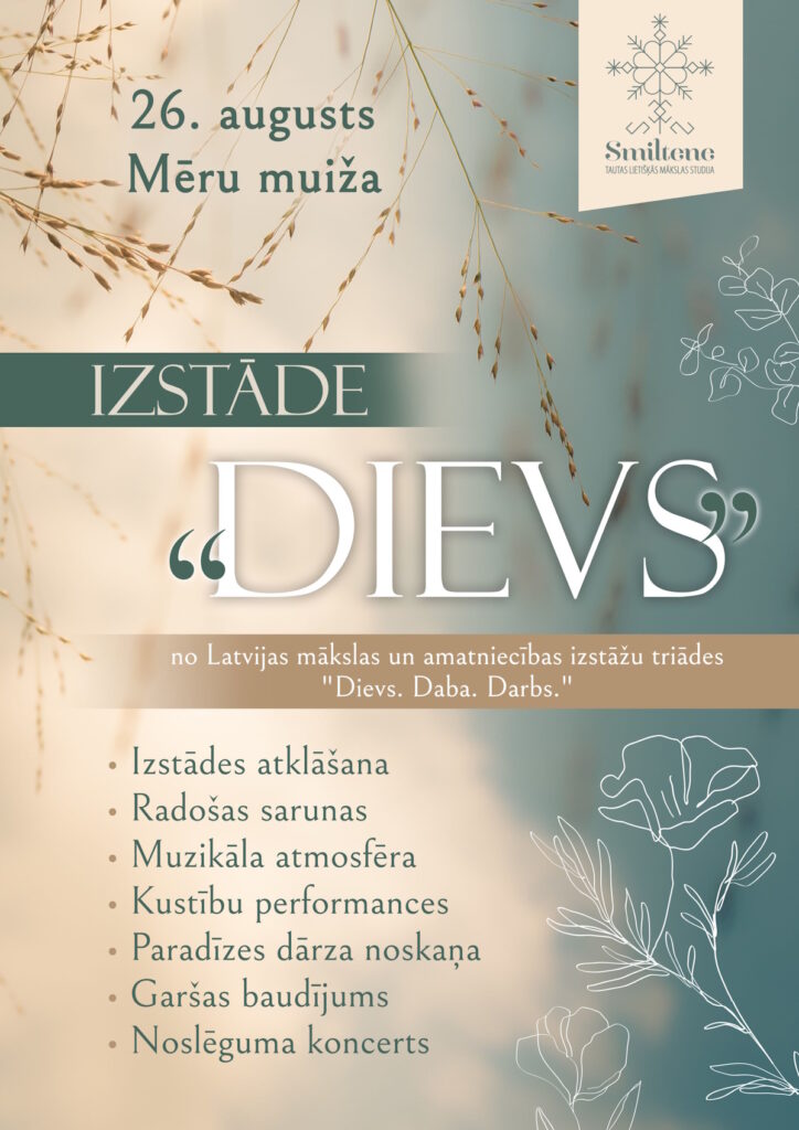 Esam priecīgi paziņot par Latvijas mākslas un amatniecības izstādi “Dievs”. Tā norisināsies izstāžu triādes “Dievs. Daba. Darbs” ietvaros. Lai atzīmētu šo svarīgo notikumu, aicinām jūs pievienoties mums 26. augustā Mēru muižā, kur notiks izstādes atklāšana.