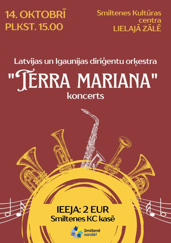 Diriģentu orķestra “Terra Mariana” divu dienu radošā nometne noslēgsies 14. oktobrī Smiltenes Kultūras centrā ar burvīgu melodiju, emociju un dvēselisku siltuma pilnu koncertu. Šāda veida projekts veicina starptautiskas sadarbības tīkla veidošanu starp orķestriem, paaugstina pūtēju orķestra līmeni reģionā un ļauj iepazīt kaimiņvalsts repertuāru. Orķestra sastāvā muzicēs 35 diriģenti un skolotāji no 22 Igaunijas (Viljandi, Lihula, Torva, Anstla, Kuresāre, Karksi – Nuia, Avinurme, Repina, Valga un Tartu) un Latvijas pilsētām un apdzīvotām vietām (Smiltene, Cēsis, Valka, Gulbene, Sigulda, Rūjiena, Salacgrīva, Inčukalns un Rīga).