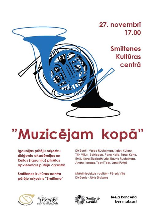 Latvijā jau otro reizi viesosies apvienotais Igaunijas pūtēju orķestru diriģentu akadēmijas un Keilas (Igaunija) pilsētas pūtēju orķestris. Kopā ar Latvijas kolektīvu no Smiltenes, Igaunijas mūziķi koncertā “Muzicējam kopā” pieskandinās krāšņo Smiltenes Kultūras centra Lielo zāli.