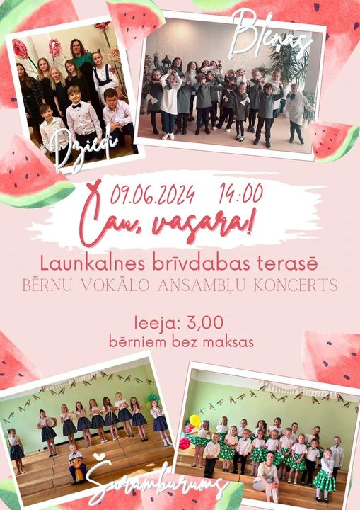9.jūnijā 14.00 Launkalnes brīvdabas terasē bērnu vokālo ansambļu koncerts „Čau, vasara!”. Koncerta apmeklējums 3,00 EUR (bērniem bez maksas). Launkalnes Tautas nams