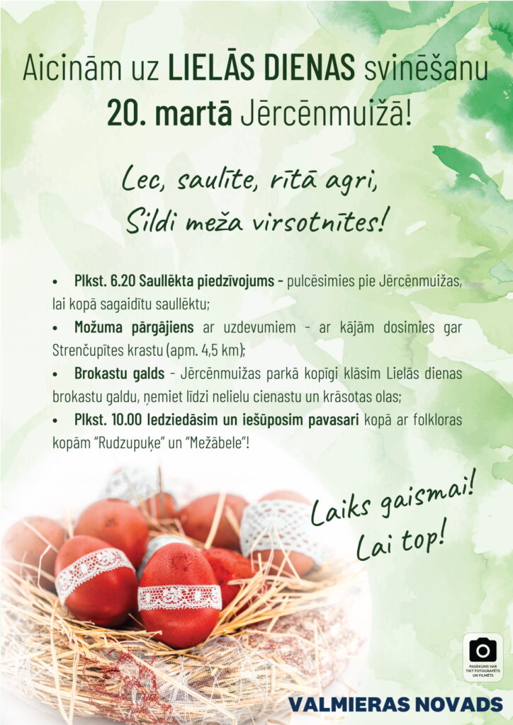 20.martā Jērcēnmuižā aicinām svinēt pavasara saulgriežus jeb Lielo dienu. Saules mūžīgo ritējumu debesu jumā nevar apturēt neviens. Klāt laiks, kad diena un nakts ir vienādā garumā – Lielā diena jeb pavasara saulgrieži. Gaisma atkal uzveic tumsu, dienai kļūstot garākai jeb lielākai par nakti. Iestājas pavasaris. Šogad tas notiks 20. martā, tāpēc aicinām iešūpoties pavasarim un jaunajam darbu cēlienam!
