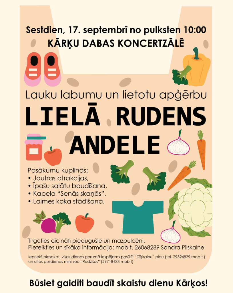 Sestdien, 17. septembrī no pulksten 10.00 Kārķos Dabas koncertzālē notiks lauku labumu, lietotu apģērbu un apavu tirdziņš – Lielā rudens andele, kurā būs iespēja iegādāties dārza, meža un virtuves labumus, lietotus apģērbus, apavus, baudīt īstu lauku tirgus noskaņu.