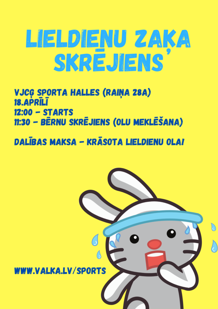 18.aprīlī plkst.12.00 pie Valkas Jāņa Cimzes Ģimnāzijas sporta halles “Lieldienu zaķa skrējiens”.