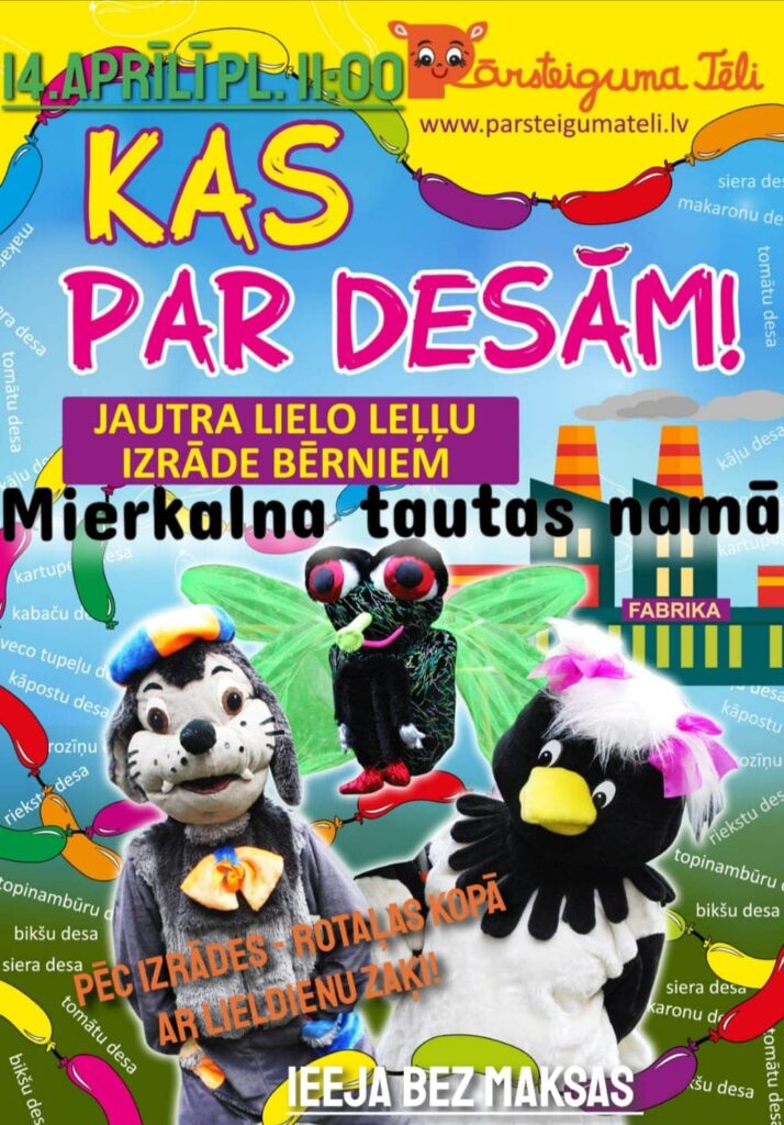 14.aprīlī plkst. 11.00 Mierkalna tautas namā Lieldienu ieskandināšanas pasākums – Jautra lielo leļļu izrāde bērniem “Kas par desām?”