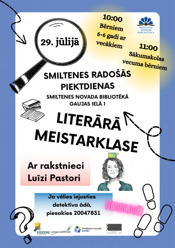 Smiltenes novada bibliotēkā, Gaujas ielā 1, Sporta halles otrajā stāvā, 29.jūlijā viesosies un vadīs literāro meistarklasi bērnu grāmatu sērijas “Mākslas detektīvi” autore Luīze Pastore. Radošās darbnīcas laikā bērni iejutīsies detektīvu ādā, ar īpašas detektīvspēles palīdzību izzinot mākslas darbu tapšanas aizkulises. Pēc spēles kopā ar autori tiks radītas detektīvgrāmatiņas. L.Pastores rosināti un atbalstīti, meistardarbnīcas dalībnieki mācīsies atraisīt savu iztēli un radīt ar Smiltenes vēsturi un pilsētvidi saistītus tēlus un literārus scenārijus.