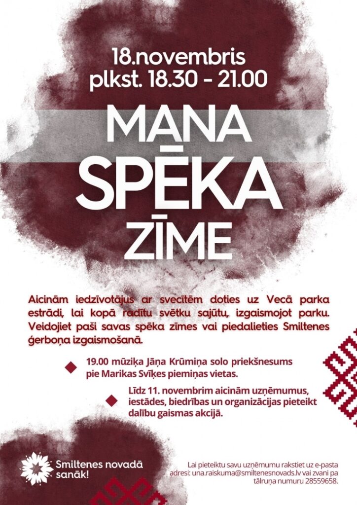 Par godu Latvijas Republikas proklamēšanas 106. gadadienai, 18. novembrī pulksten 18.30 Smiltenē aicinām iedzīvotājus ar svecītēm doties uz Vecā parka estrādi, lai kopā radītu svētku sajūtu, izgaismojot parku, veidojot paši savas spēka zīmes vai piedalieties Smiltenes ģerboņa izgaismošanā.