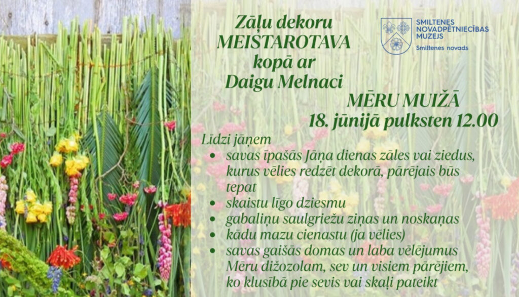 18. jūnija dienas pašā viducī – pulksten 12.00 – aicinām iegrimt tuvojošās Jāņa dienas zāļu smaržās un darināt savu saulgriežu zāļu dekoru. Kā to darināt – rādīs un palīdzēs meistare Daiga Melnace.