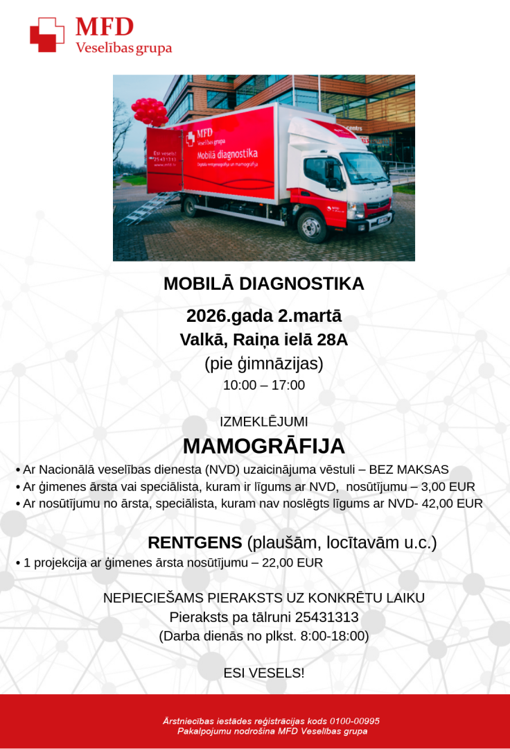 2. martā Valkā, Raiņa ielā 28A (pie ģimnāzijas), iedzīvotājiem būs pieejami MFD Veselības grupas mobilās diagnostikas pakalpojumi. Mobilais diagnostikas kabinets darbosies no plkst. 10.00 līdz 17.00.