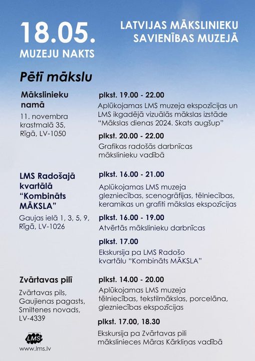 18.maijā no plkst. 18.00 līdz 20.00 Latvijas mākslinieku savienības muzejā Zvārtavas pilī, Gaujienas pagastā Muzeju nakts “Pētī Mākslu!”. Radošās darbnīcas un mākslas ekspozīcijas. Zvārtavas pils