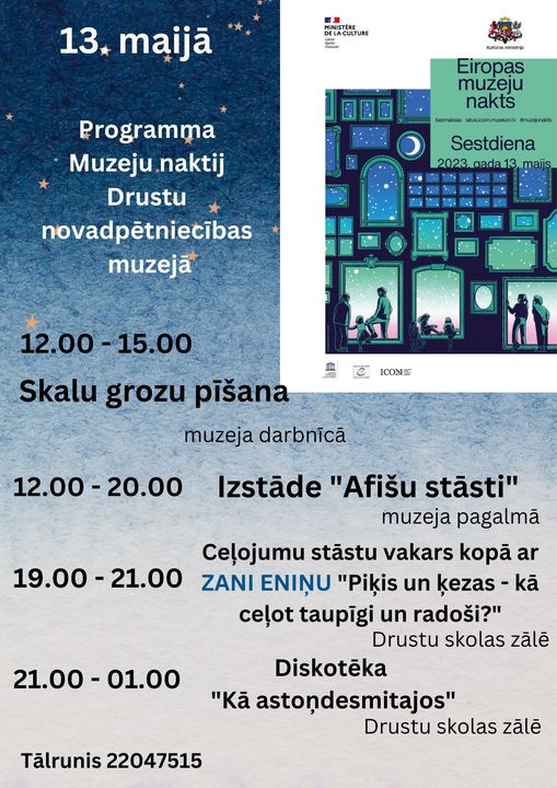 Jau 19. reizi muzeji visā Latvijā aicinās uz Muzeju nakts pasākumiem. Arī Drustu novadpētniecības muzejs ir sagatavojis programmu un aicina apmeklēt pasākumus un darboties. Šogad darināsim skalu grozus kopā ar Anitu Muižnieci. Lai darbotos šajā darbnīcā, ir iepriekš jāpiesakās. Ceļojumu stāstu vakars kopā ar Zani Eniņu. Tas norisināsies sadarbībā ar Drustu bibliotēku Liels paldies par šo iespēju Aijai Ciguzei! Interesanta būs arī diskotēka, ko vadīs Vladimirs Kovriga, gluži kā astoņdesmitajos – mūzikas atskaņojums ar lenšu magnetofonu. Uz tikšanos Muzeju nakts pasākumos Drustos!