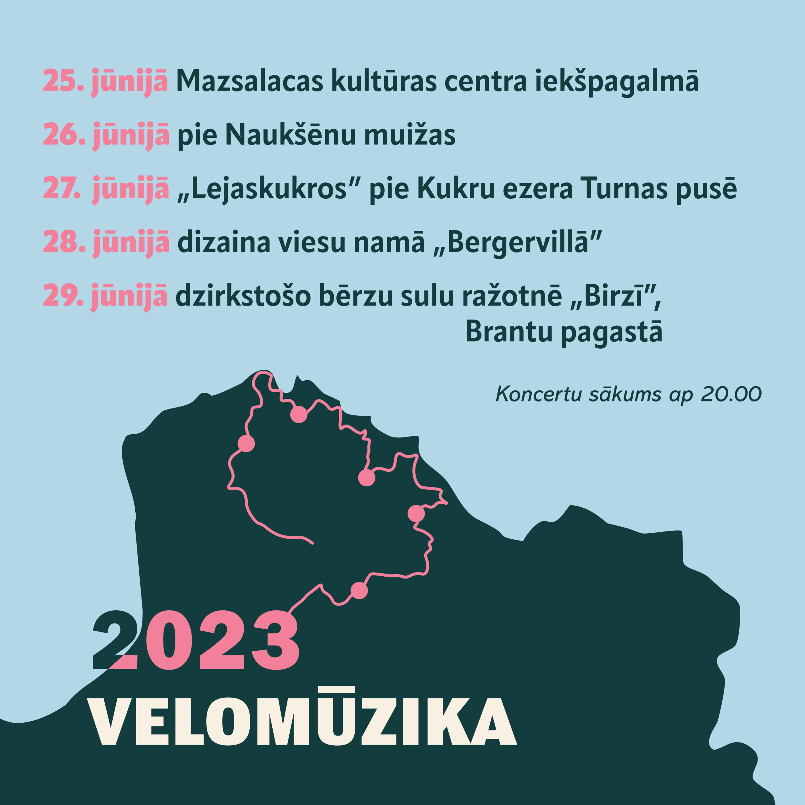 Jau trīspadsmito reizi pa Latvijas lauku ceļiem un takām pedāļus pretī koncertiem un naktsmājām mīs muzikālā ceļojuma “Velomūzika” dalībnieki. Šogad maršruts metīs plašu loku pa Vidzemi un ik vakara akustiskie koncerti arī plašākai publikai būs pieejami šādās tikšanās vietās: