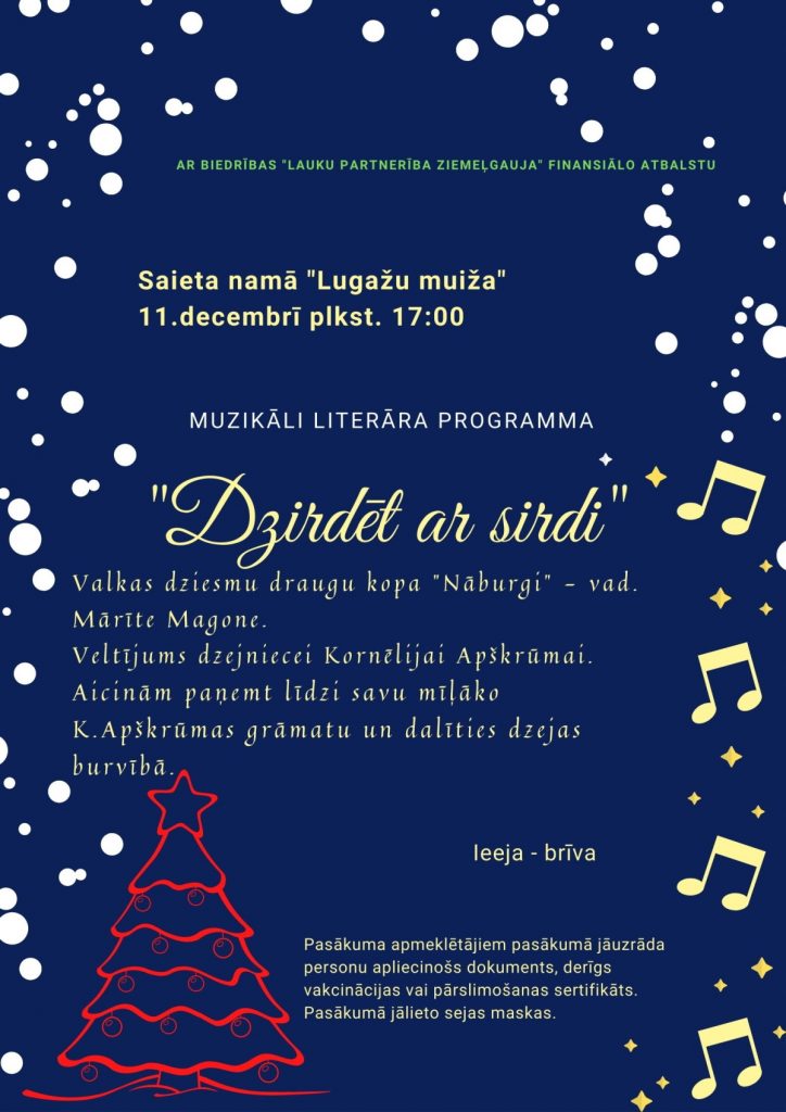 Saieta namā “Lugažu muiža” 11. decembrī plkst. 17:00 muzikāli literāra programma “Dzirdēt ar sirdi”. Valkas dziesmu draugu kopa “Nāburgi” – vadītāja Mārīte Magone.
