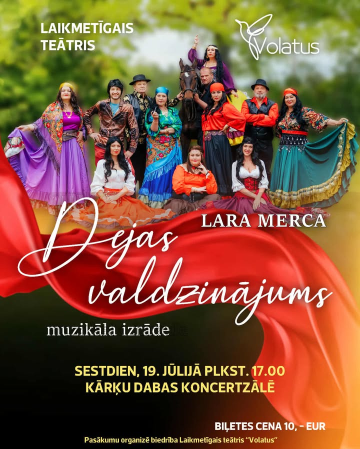19. jūlijā plkst. 17.00 Kārķu Dabas koncertzālē notiks Laikmetīgais teātris “Volatus”. Mūzikls “Dejas valdzinājums” (ar romu mūziku).