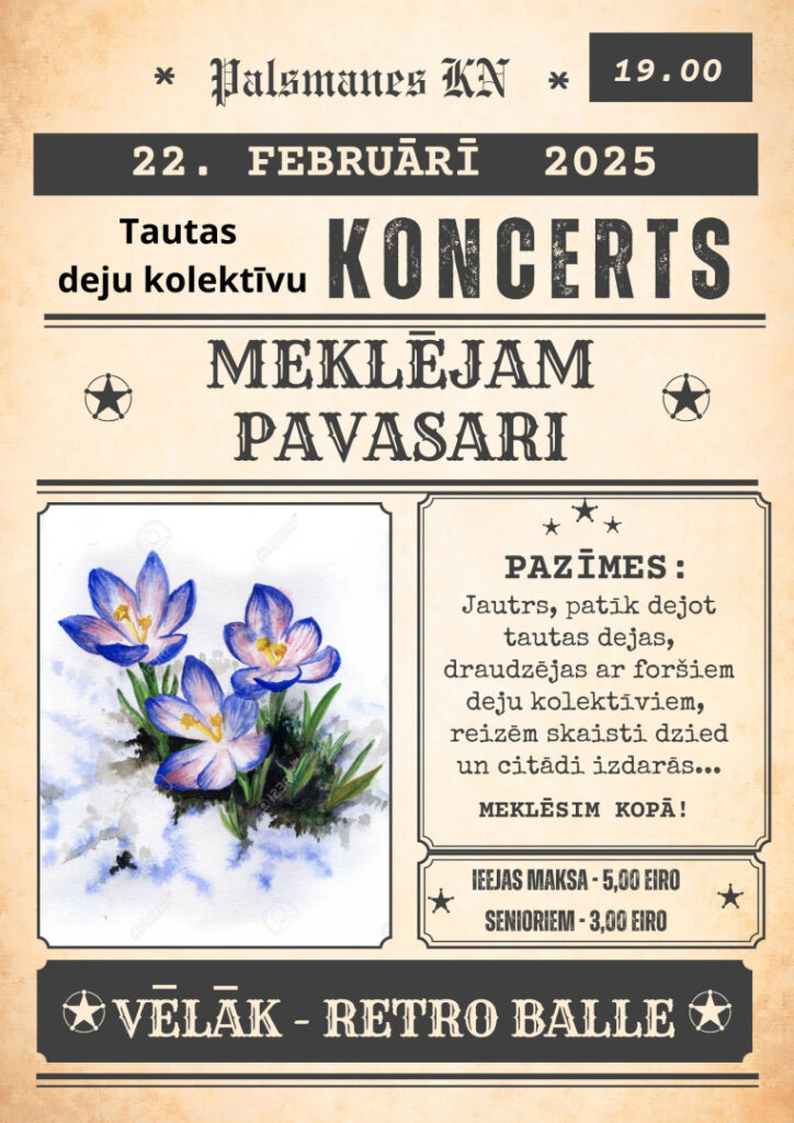 Kopā ar dažādiem deju kolektīviem meklēsim pavasara pirmos vēstnešus! Pasākuma pazīmes – jautras tautas dejas, skaista dziedāšana un draudzīga atmosfēra. Biļetes cena: