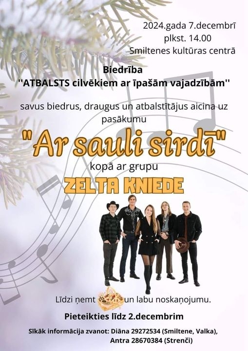 2024.gada 7. decembrī plkst. 14.00 Smiltenes Kultūras centrs Biedrība ATBALSTS cilvēkiem ar īpašām vajadzībām savus biedrus, draugus un atbalstītājus aicina uz pasākumu “Ar sauli sirdī”. Pasākumu kuplinās deju kolektīvs “Pīlādzītis”, koris “Mežābele” un viesi.