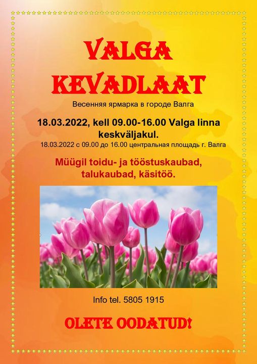 Piektdien, 18. martā, no pulksten 9 līdz 16 dvīņu pilsētas Valgas centrālajā laukumā norisināsies “Pavasara gadatirgus”. Aicinājums apmeklēt tirgu ievietots sociālajos tīklos grupā “Valka – Valga community”.
