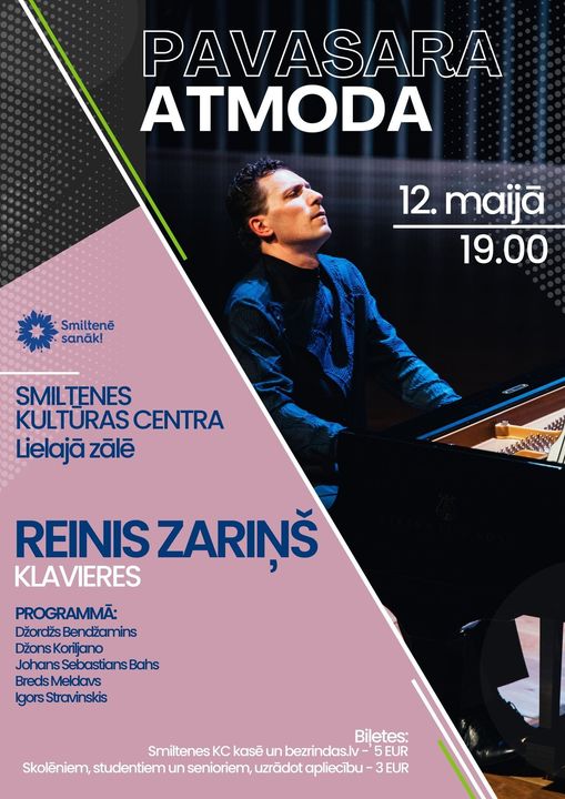 12.maijā 19.00 Smiltenes Kultūras centra lielajā zālē, pianista Reiņa Zariņa solokoncerts “Pavasara atmoda”.