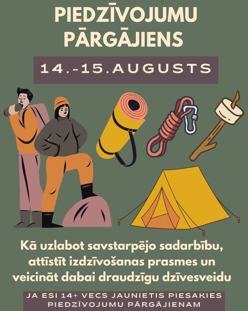 Ja esi gana izturīgs, lai noietu 20km ar kājām, un nebaidies no skudrām, piesakies Piedzīvojumu pārgājienam un Tu iegūsi ne tikai jaunas izdzīvošanas, bet arī sadarbības prasmes, kā arī uzzināsi vairāk par dabai draudzīgu dzīvesveidu.