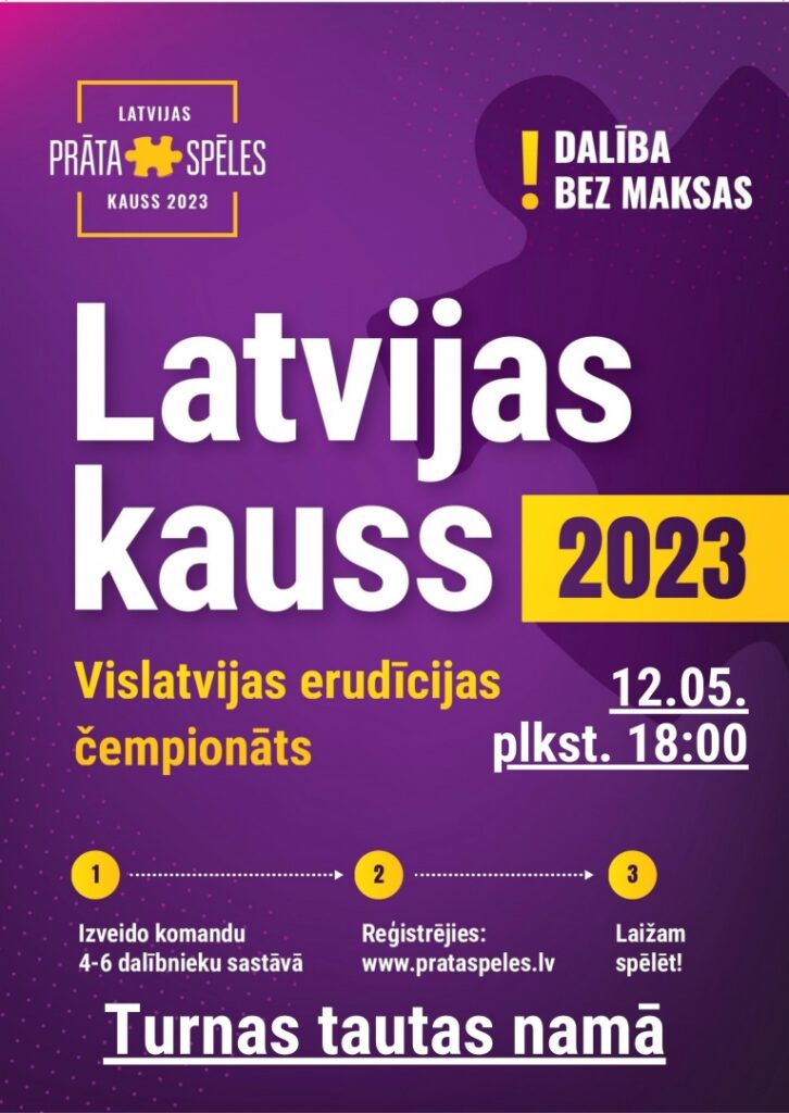 Atklāta pieteikšanās „Prāta Spēles” Vislatvijas erudīcijas čempionātam „Latvijas kauss 2023” erudīcijas spēlei, kas norisināsies 12.05.2023., plkst. 18:00 „Turnas Tautas namā”!
