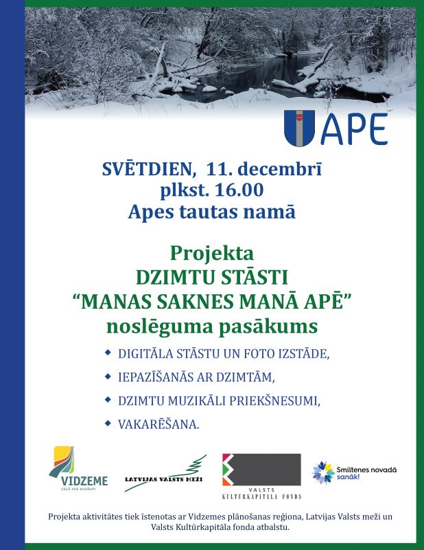 Aicinām 11. decembrī plkst.16.00 Apes tautas namā uz projekta “Manas saknes manā Apē” noslēguma pasākumu, kurā varēs skatīt digitālu stāstu un foto izstādi, iepazīties ar dzimtām, būs dzimtu muzikāli priekšnesumi, vakarēšana. Mēs radīsim risinājumus, lai ne tikai šajā projektā radītie stāsti un fotogrāfijas, bet arī turpmākie stāsti un fotogrāfijas pārtapu izstādēs un notikumos, kuros tiekamies, atceramies pagātni un svinam šodienu.