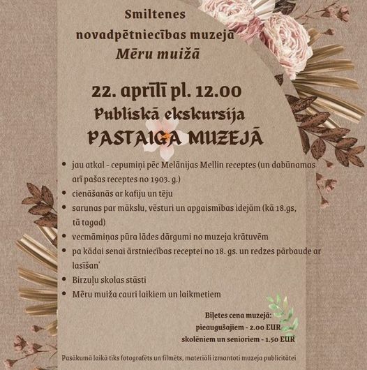 Šajā gadā iesākto tradīciju turpinot, 22. aprīļa pusdienlaikā – pulksten 12.00 – Smiltenes novadpētniecības muzejs Mēru muižā atkal gaidīs apmeklētājus uz publisko ekskursiju “Pastaiga muzejā”, kuras laikā iepazīs Mēru muižas ēku, uzzinās par tās agrāko un vēlāko vēsturi, būves sākotnējo plānojumu un interjeriem, bet muzeja ekspozīcijās un izstādēs aplūkos muzeja krājumā esošajās senlietas – darbarīkus, daiļamatniecības darinājumus, apģērbu, arī mūzikas instrumentus, mēbeles un lietas no pirmskara interjera, kā arī aktuālās izstādes.