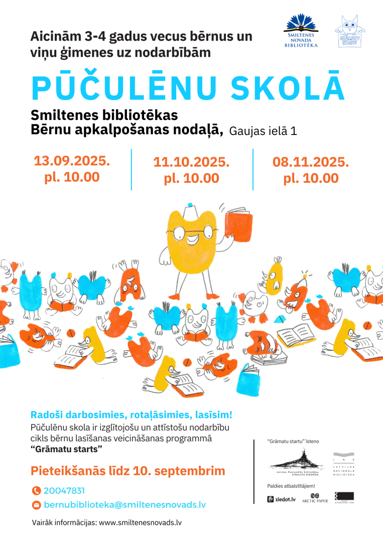 Smiltenes bibliotēkas Bērnu apkalpošanas nodaļa aicina 3 – 4 gadus vecus bērnus kopā ar vecākiem piedalīties lasīšanas veicināšanas programmas “Grāmatu starts” nodarbībās “Pūčulēnu skola”.