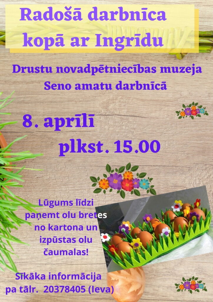Radošā darbnīca kopā ar Ingrīdu Drustu novadpētniecības muzeja Seno amatu darbnīcā 8. aprīlī, plkst. 15.00.