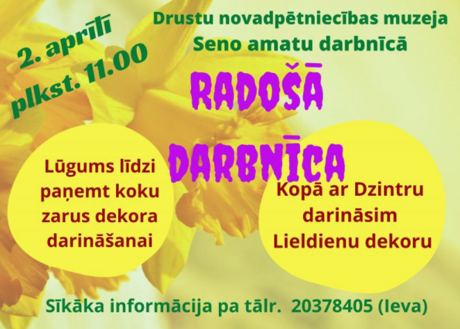 Radošā darbnīca Drustu novadpētniecības muzeja Seno amatu darbnīcā 2. aprīlī, plkst. 11.00.