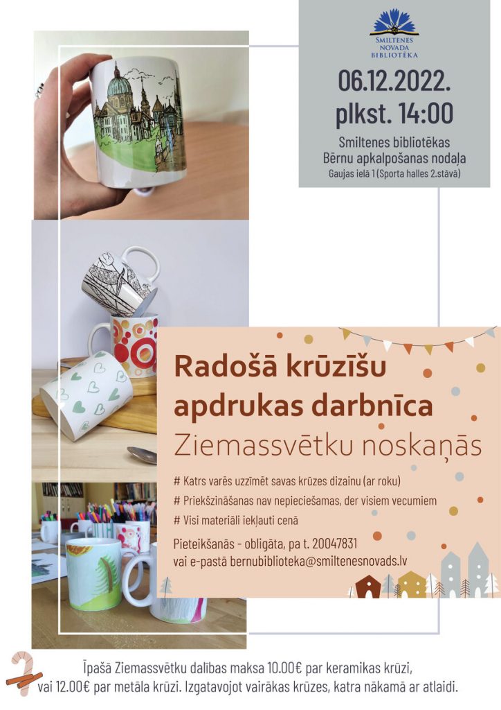 Smiltenes bibliotēkas Bērnu apkalpošanas nodaļa 6.decembrī plkst. 14.00 aicina piedalīties pirmssvētku radošajā darbnīcā “Krūžu dizaina darbnīca”.