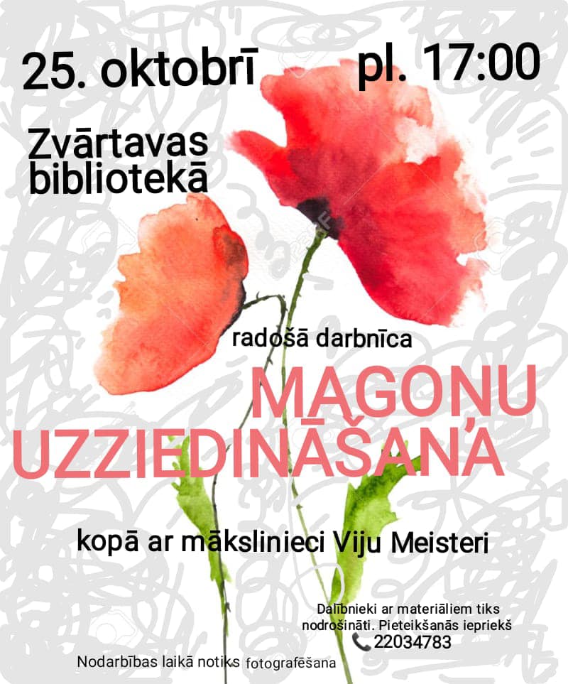 25. oktobrī plkst. 17.00 Zvārtavas bibliotēkā radošā darbnīca “Magoņu uzziedināšana” kopā ar mākslinieci Viju Meisteri. Dalībnieki ar materiāliem tiks nodrošināti. Iepriekš jāpiesakās pa tālruni +371 22034783.