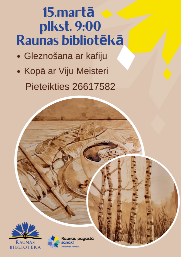 15.martā plkst.9.00 Raunas bibliotēkā norisināsies gleznošana kafijas tehnikā kopā ar Viju Meisteri. Interesentus lūdzam pieteikties zvanot pa tālr. 26617582.