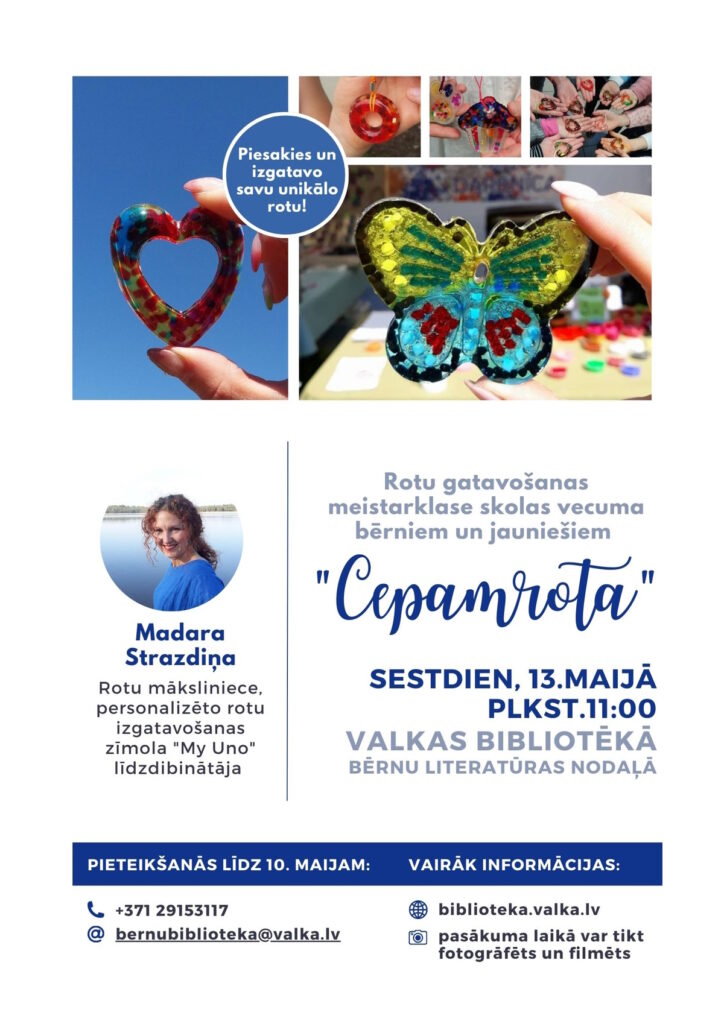 Šo sestdien, 13. maijā Valkas bibliotēkas Bērnu literatūras nodaļā notiks rotu mākslinieces Madaras Strazdiņas radošā darbnīca “Cepamrota”. Tās laikā mākslinieces vadībā būs iespējams izgatavot dažādu formu un veidu rotas no krāsainiem izejmateriāliem – granuliņām. Pieteikties meistarklasei iespējams līdz 10. maijam uz vietas bibliotēkā, zvanot 29153117 vai rakstot [email protected].