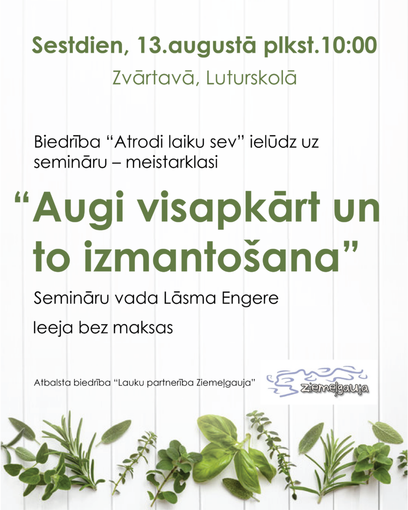 13.augustā plkst. 10.00 Luturskolā biedrība “Atrodi laiku sev” ielūdz uz semināru – meistarklasi “Augi visapkārt un to izmantošana”.