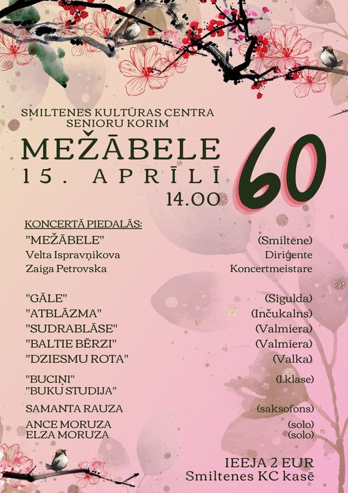 15. aprīlī plkst. 14.00 senioru jauktais koris “Mežābele” un Smiltenes Kultūras centrs aicina uz kora “Mežābele” 60 gadu jubilejas koncertu!