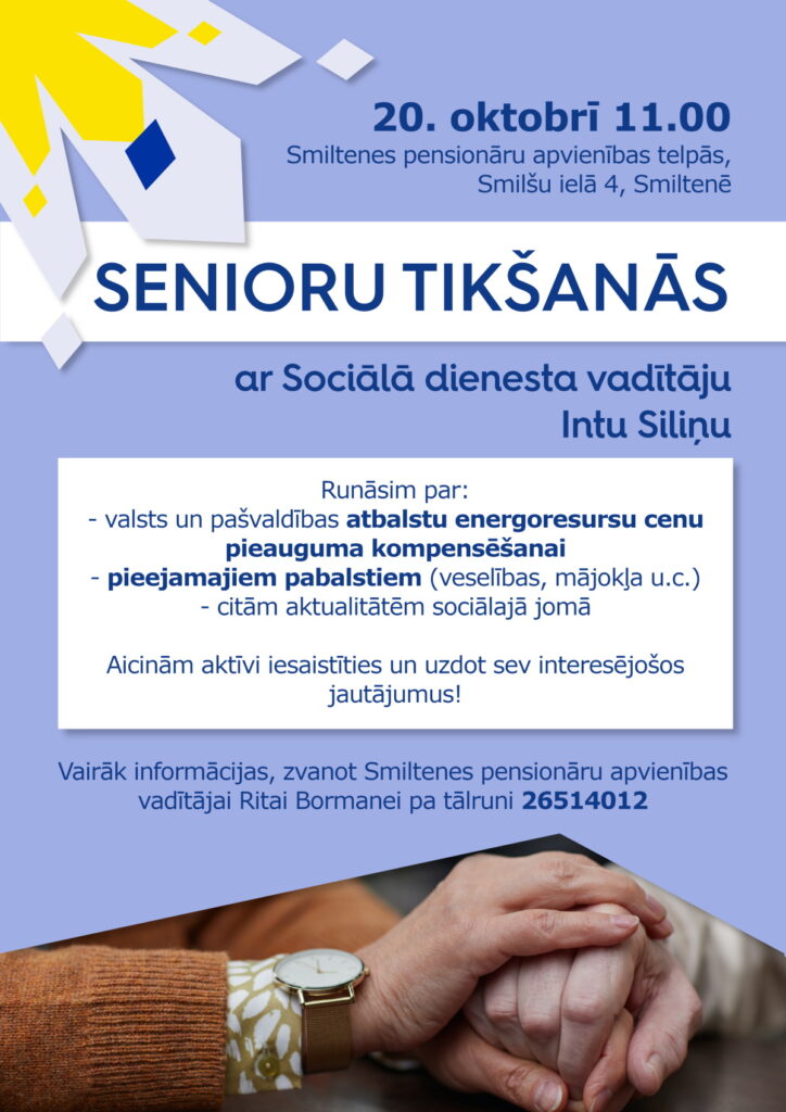 20.oktobrī pulksten 11.00 pensionāru apvienības telpās, Smilšu ielā 4, Smiltenē, notiks senioru tikšanās ar pašvaldības Sociālā dienesta vadītāju Intu Siliņu.