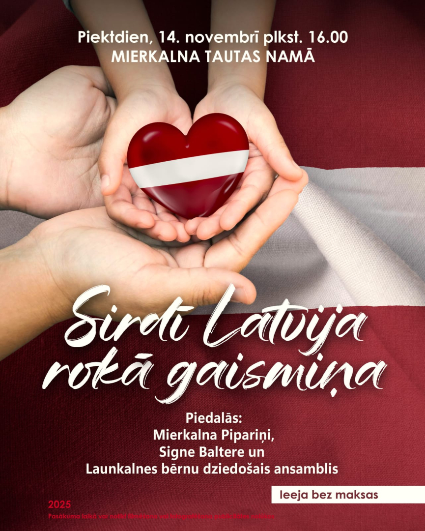 2025. gada 14. novembrī plkst. 16.00 Mierkalna tautas namā notiks īpašs Latvijas valsts svētkiem veltīts koncerts “Sirdī Latvija rokā gaismiņa”, kas vienos klausītājus sirsnīgā un patriotiskā noskaņā, godinot Latvijas dzimšanas dienu.