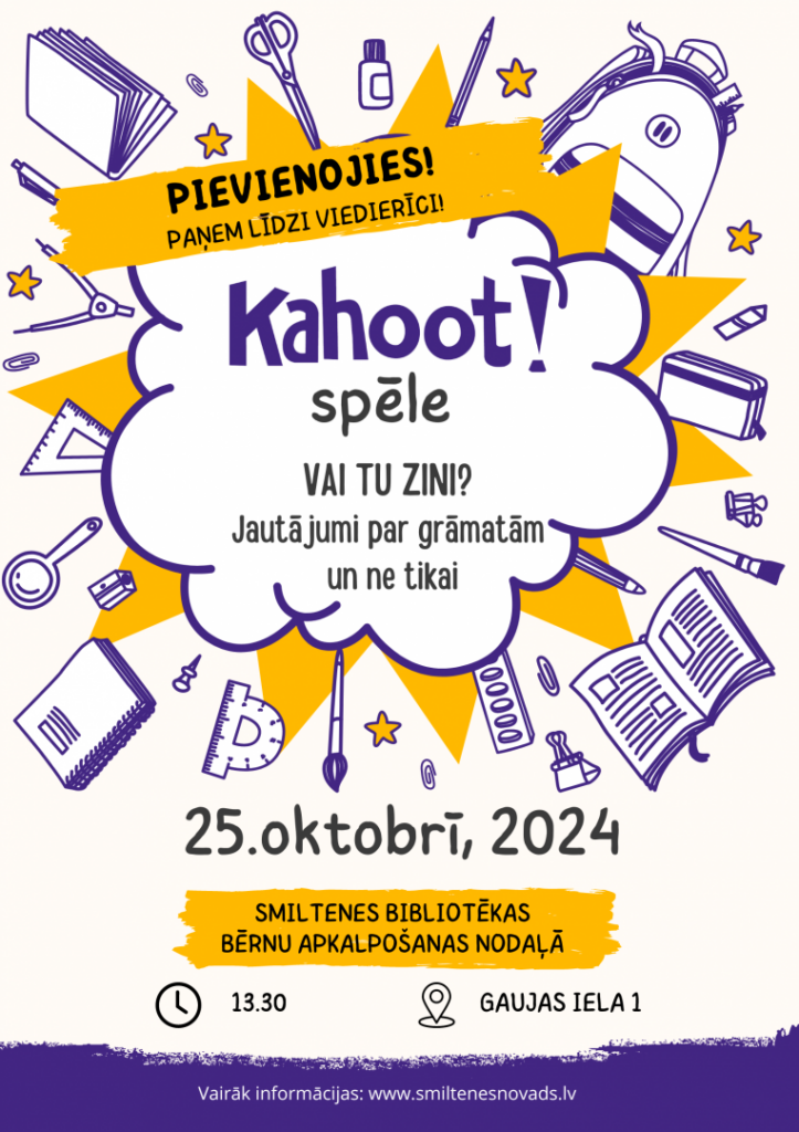 Piektdien, 25.oktobrī, plkst. 13.30 aicinām bērnus un jauniešus uz Smiltenes bibliotēkas Bērnu apkalpošanas nodaļu, lai piedalītos aizraujošā Kahoot spēlē “Vai tu zini? Jautājumi par grāmatām un ne tikai”. Spēle būs lieliska iespēja pārbaudīt savas zināšanas un sacensties ar citiem dalībniekiem. Lūdzam ņemt līdzi viedierīci.