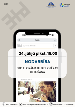 24.jūlijā, pulksten 15.00 Smiltenes bibliotēkā notiks nodarbība par “3td e-grāmatu bibliotēkas” lietošanu.