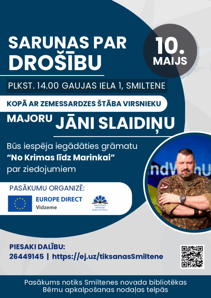 Europe Direct centrs “Vidzeme” sadarbībā ar Smiltenes novada bibliotēku 10. maijā aicina uz publisku sarunu ar vienu no pazīstamākajiem militārajiem ekspertiem Latvijā – Zemessardzes štāba virsnieku majoru Jāni Slaidiņu.