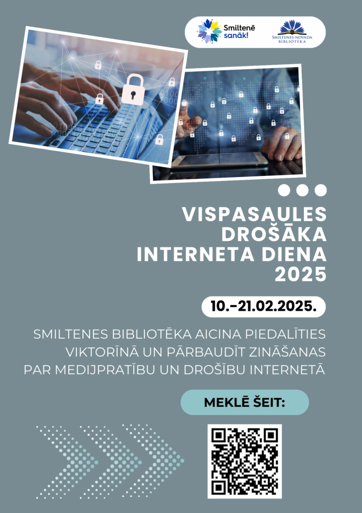 Smiltenes bibliotēkas Pieaugušo apkalpošanas nodaļa no 10. līdz 21.februārim aicina piedalīties tiešsaistes viktorīnā un pārbaudīt zināšanas par medijpratību un drošību internetā. Viktorīnas aizpildīšanas laiks no 3 līdz 6 min., kopā 10 jautājumi. Viens pareizo atbilžu iesniedzējs saņems pārsteiguma balviņu no bibliotēkas! Pareizās atbildes uz viktorīnas jautājumiem tiks publicētas 25. februārī bibliotēkas Facebook kontā.