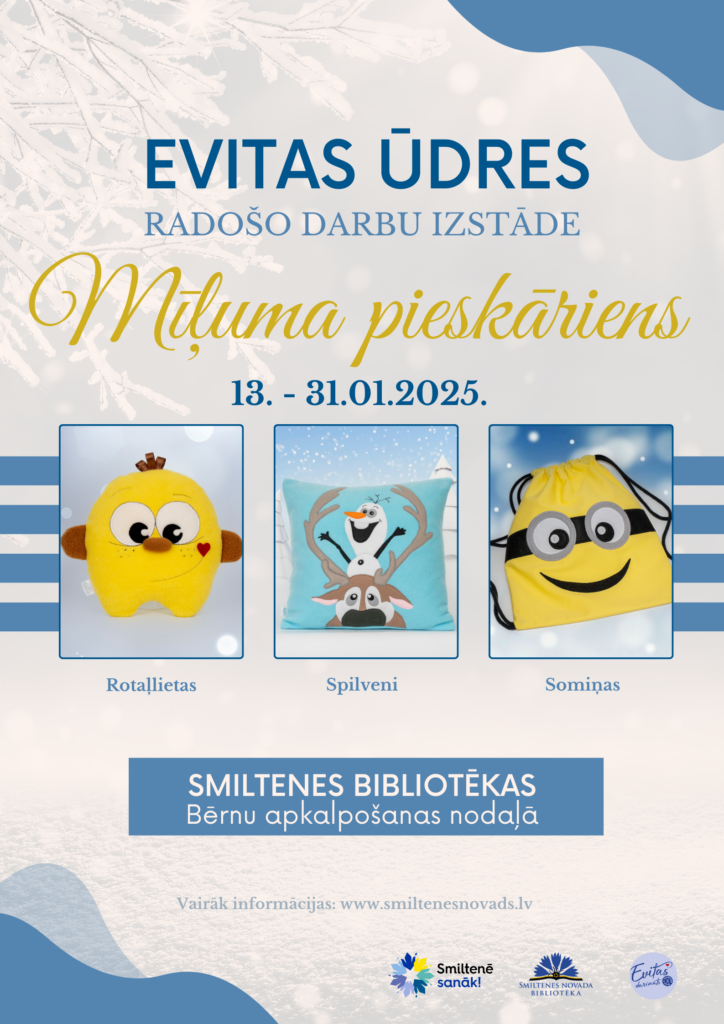 Smiltenes bibliotēkas Bērnu apkalpošanas nodaļā no 13. līdz 31. janvārim apskatāma Evitas Ūdres šūto darbu izstāde “Mīļuma pieskāriens”. Izstādē skatāmas rotaļlietas, mājīgi mīļspilveni un praktiskas somiņas bērniem.