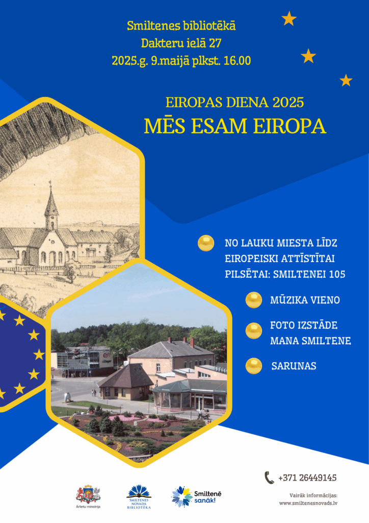 Prezentācijā “No lauku miesta līdz eiropeiski attīstītai pilsētai: Smiltenei 105” iepazīsim Smiltenes pilsētas vēsturi un izaugsmi gadu gaitā, kā Smiltenē realizētie ES projekti uzlabojuši iedzīvotāju dzīves kvalitāti. Ikviens no mums, šeit strādājot, mācoties, sniedz ieguldījumu savas dzimtās vietas, valsts un Eiropas attīstībā. Pasākuma laikā novērtēsim radošo smilteniešu sniegumu – Evas Uldriķes atskaņotās dažādu Eiropas valstu dziesmas un atklāsim novadnieka Deivida Džonsa fotogrāfiju izstādi. Atzīmējot Eiropas dienu, aicinām Smiltenes novada iedzīvotājus novērtēt iespējas, ko mums sniedz dalība ES, sajust ikviena piederības sajūtu plašajai Eiropas saimei, bet tajā pašā laikā būt lepniem par savu dzimto vietu, kultūru un tradīcijām.